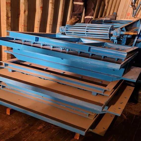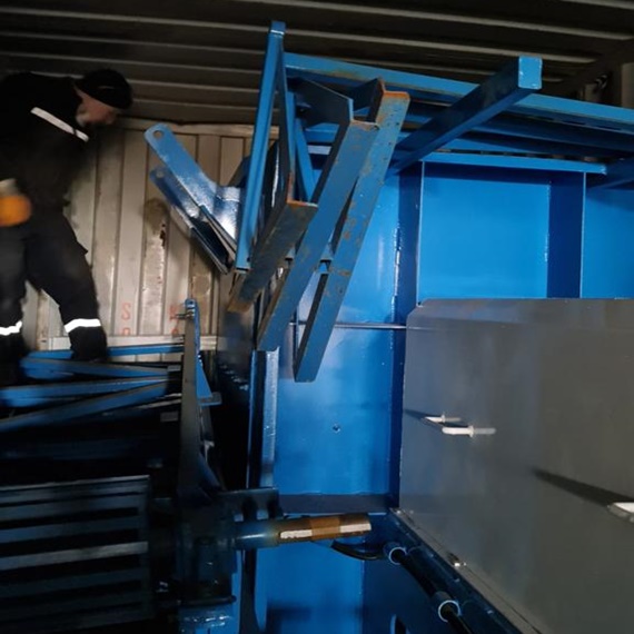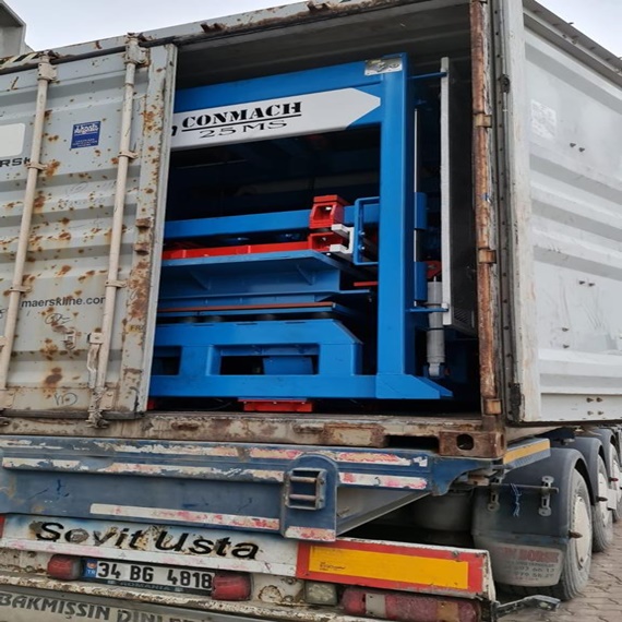Kamerun’ a sevk edilen beton blok yapma makinesi diğer model çeşitlerimiz gibi hava koşullarına dayanıklılığı ile biliniyor. Makinemizin özelliklerinden kısaca bahsedecek olursak palet ölçüsü 95cmX115cmX40mm, blok kalıbı baskı kalınlığı 15- 20 mm, parke kalıbı baskı kalınlığı 10- 12 mm. Karıştırıcı çıkış hacmi 0.5 m3 olup gövde sacı için 8 mm st52 karbon çeliği, aşınma saclarında ise 10 mm ST52 ve Hardox 400 kullanılmıştır. Kamerun Doula port limanına doğru ilerleyen konteyner içinde bulunan taşıma bandı kauçuk ölçüsü 60 cm X 15 m – 18 m.