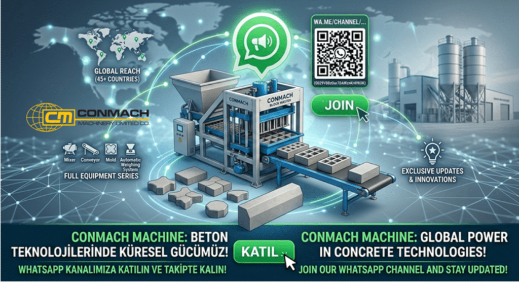 45’ten fazla ülkede beton üreticileri için inşaat ekipmanları üreten lider markalardan biri olarak, artık WhatsApp kanalımızdayız! Conmach Machine olarak, beton blok ve parke taşı makinelerinden bordür makinelerine, bantlı konveyörlerden mikserlere ve yüksek kaliteli kalıplara kadar tüm fabrika donanımlarımızı burada sergiliyoruz. İster otomatik tartım sistemli ister standart modeller olsun, en yeni teknolojilerimizi ve sektörel duyurularımızı kaçırmayın. Küresel tecrübemizle üretiminizi güçlendirmek için kanalımıza davetlisiniz.